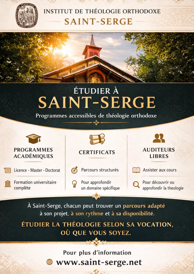 Dernièrement sur ses réseaux sociaux, l’Institut de théologie orthodoxe Saint-Serge a informé sur les différents parcours de formation qu’il propose grâce à plusieurs affichettes. En voici quelques-unes. On peut retrouver des informations sur ces formations à partir de cette page (voir sous chaque onglet). Il est en souvent question sur les réseaux sociaux de l’Institut Saint-Serge : Facebook, Instagram, X (ex-Twitter). On peut en outre retrouver de nombreuses vidéos de l’Institut Saint-Serge sur Viméo et sur YouTube.